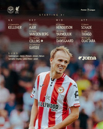 Đội hình xuất phát của Brentford:1-Kelleher, 20-Ayer, 4-Van den Berg, 22-Collins, 33-Kayode, 6-Henderson, 18-Yarmolyuk, 24-Damsgaard, 7-Shad, 9-Thiago, 19-Ouattara