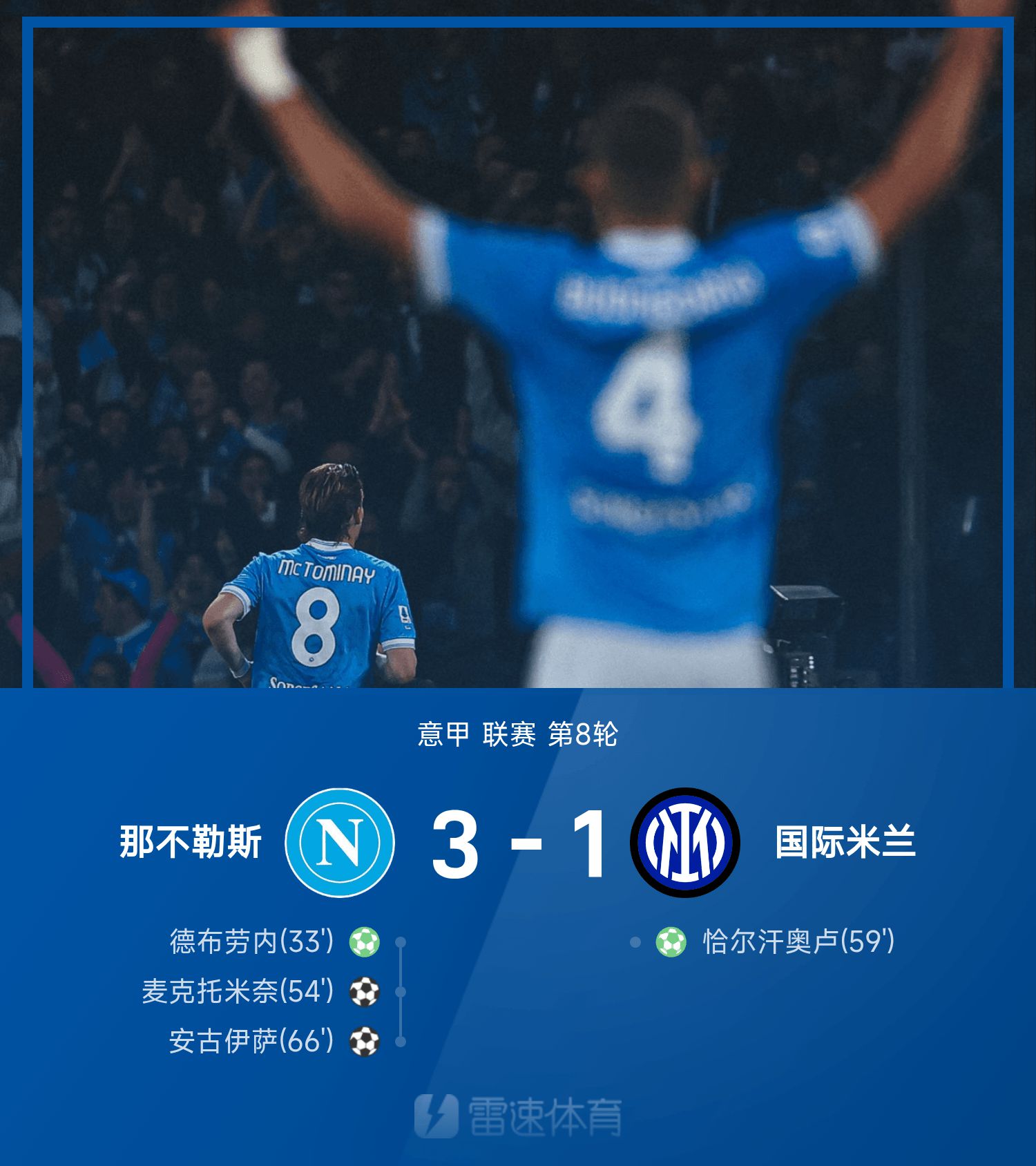 6686 Thể thao ngày 26/10 Ở vòng 8 vòng 25/26 Serie A mùa giải, Naples đã đánh bại Inter Milan với tỷ số 3-1. Trong nửa đầu trận đấu, De Bruyne đã phải nghỉ thi đấu vì chấn thương sau khi thực hiện quả đá phạt đền từ cự ly 12m. Hiệp hai trận đấu, McTominay và Anguisa liên tiếp ghi bàn, trong khi Calhanoglu ghi bàn thắng ở cự ly 12m cho Inter Milan.