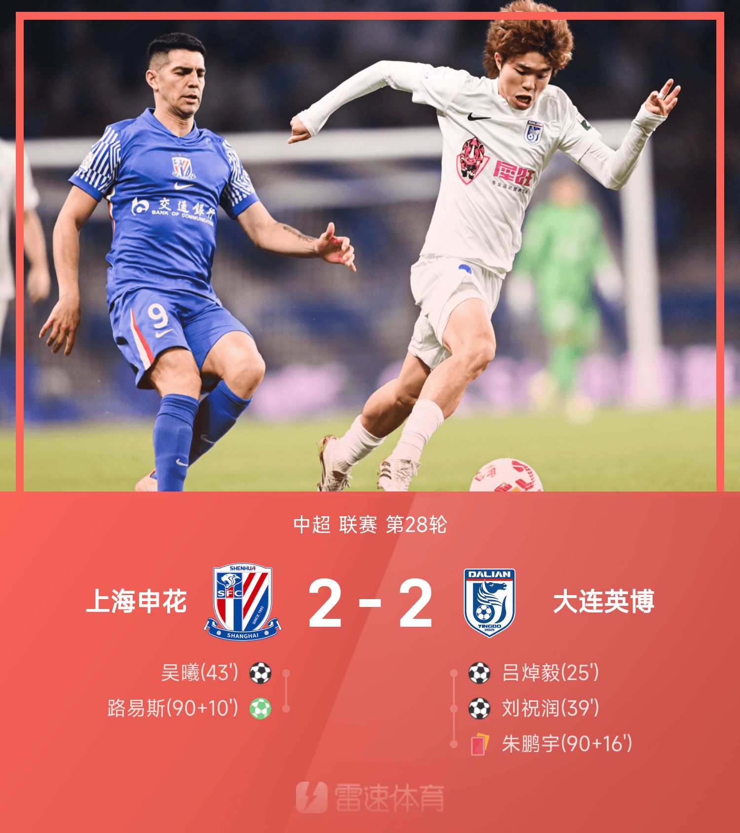 6686 Thể thao ngày 26 tháng 10 Ở vòng 28 giải Chinese Super League lần thứ 25, Shanghai Shenhua đã hòa Dalian Yingbo với tỷ số 2-2. Trong hiệp một, Lu Zhuoyi đã tạo nên làn sóng thế giới và đưa Dalian Yingbo dẫn trước. Liu Zhurun mở rộng khoảng cách và Wu Xi ghi bàn gỡ lại cho Shenhua. Sang hiệp 2, trọng tài video đã can thiệp tới 4 lần. Wu Xi và Wang Haijian sút trúng xà ngang. Phút bù giờ, video trọng tài can thiệp và Wu Xi ghi bàn thắng quyết định. Louis thực hiện quả phạt đền để hoàn tất trận hòa. Shanghai Shenhua cuối cùng hòa 2-2 với Dalian Yingbo, cách ngôi đầu bảng 2 điểm.