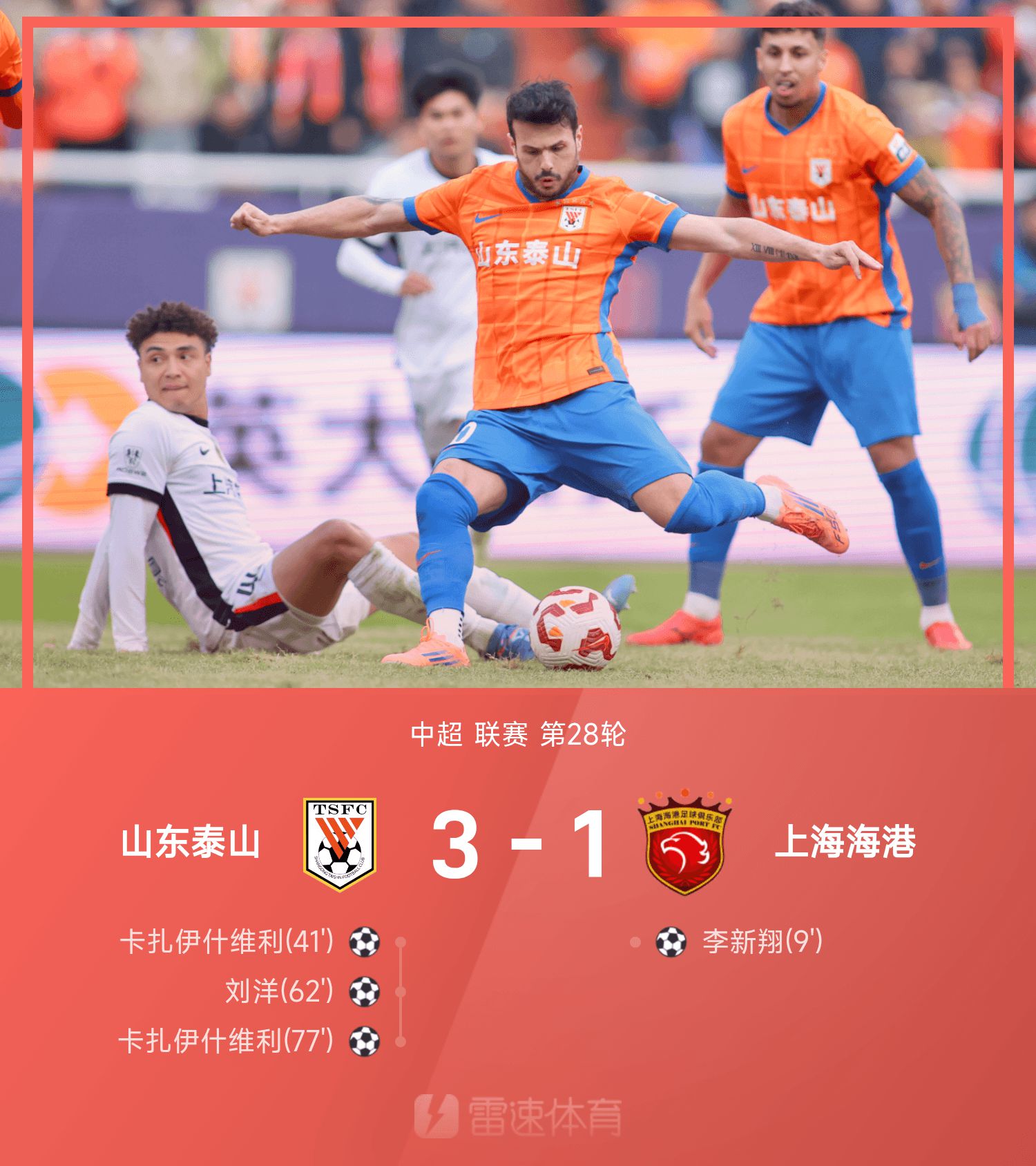 6686 Bản tin thể thao ngày 26/10 Ở vòng 28 giải Chinese Super League lần thứ 25, Shandong Taishan đã đánh bại Shanghai Haigang 3-1. Trong hiệp một, Li Xinxiang đã mở tỷ số cho Haigang, và Shandong Taishan cân bằng tỷ số nhờ đường kiến tạo của Zeka từ Kaza. Sang hiệp 2, Zeka kiến tạo cho Liu Yang đảo ngược tình thế, sau đó Cresan kiến tạo cho Kaza cú đúp để ấn định chiến thắng. Chung cuộc, Shandong Taishan đảo ngược Shanghai Haigang 3-1. Shandong Taishan đã chấm dứt chuỗi 4 trận không thắng trước đó, trong khi chuỗi 4 trận không thắng của Shanghai Haigang đã chấm dứt.