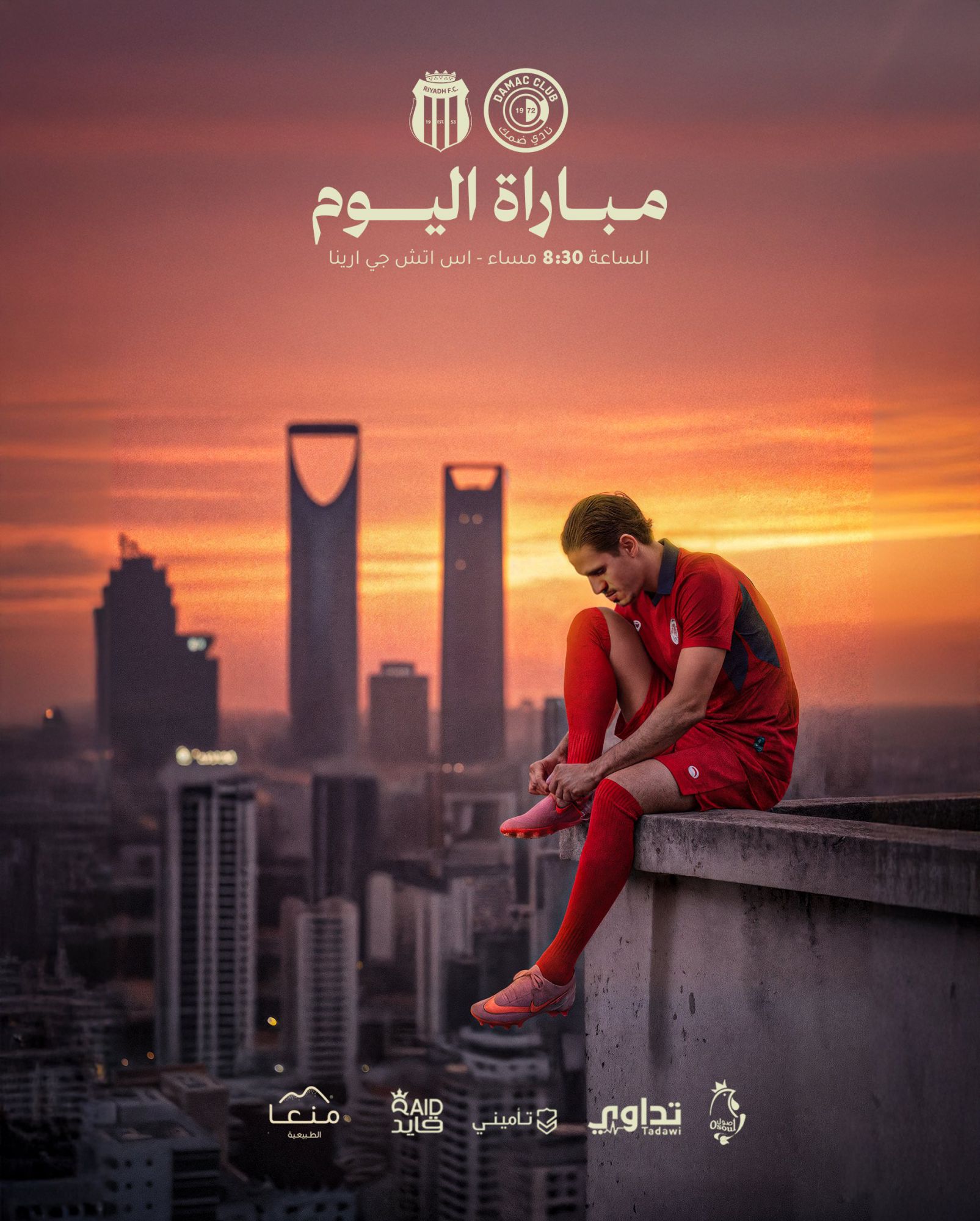 Tấm áp phích có hình các cầu thủ DAMAC mặc đồng phục của đội đang ngồi trên mép mái nhà và buộc dây giày.