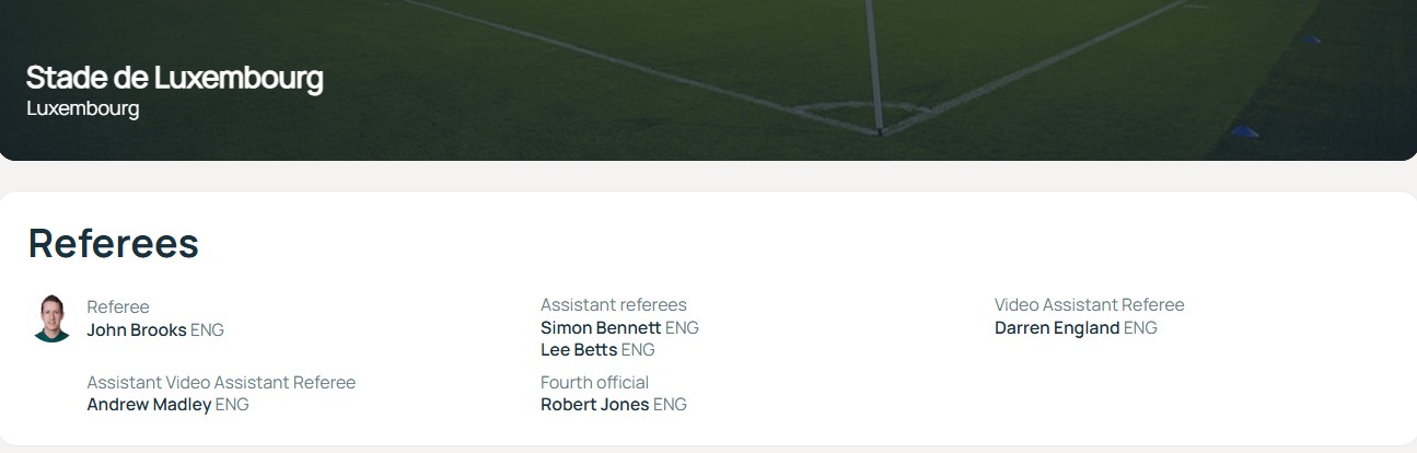 Theo các quan chức UEFA, trận đấu này sẽ được điều hành bởi đội ngũ trọng tài của Premier League. Trọng tài chính là John Brooks, và trọng tài video là Darren England.