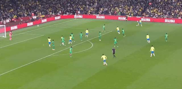 45' Khu vực ba giây của Brazil rất hỗn loạn và Ederson đã cản phá cú sút của đối thủ hai lần liên tiếp