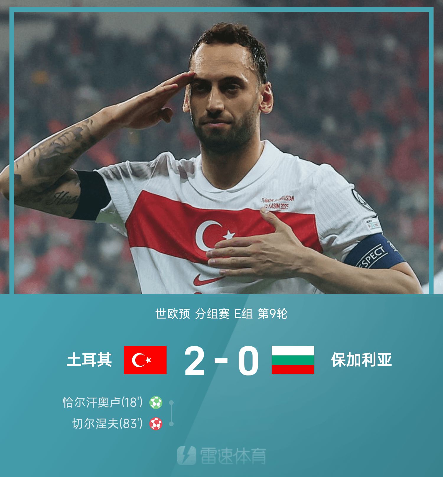 6686 Sports đưa tin ngày 16/11 rằng ở lượt 9 bảng E Vòng loại khu vực châu Âu lần thứ 26, Thổ Nhĩ Kỳ đã đánh bại Bulgaria với tỷ số 2-0. Hiệp một, Charhanoglu thực hiện quả phạt đền, sang hiệp hai, Chernev đá phản lưới nhà giúp Türkiye đánh bại đối thủ.