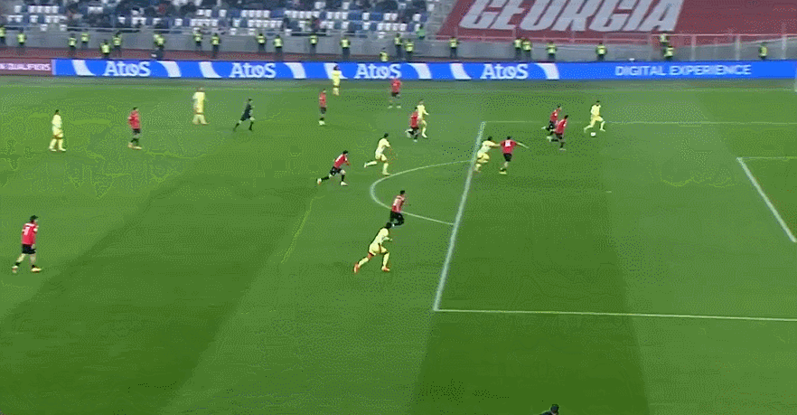Phút thứ 7 của trận đấu, Torres đột phá trong khu vực ba giây để chuyền bóng vào vòng cấm, khiến Goholishvili để chơi bóng ném. Tây Ban Nha do đó có được cơ hội ở cự ly 12m. Ovasabal sau đó thực hiện quả phạt đền ở cự ly 12m và ghi bàn thắng đầu tiên. Phút 34, Torres bước lên nhận đường chuyền ngang của Oyarzabal rồi sút vào góc xa, giúp Tây Ban Nha kéo dài tỷ số lên 3-0.