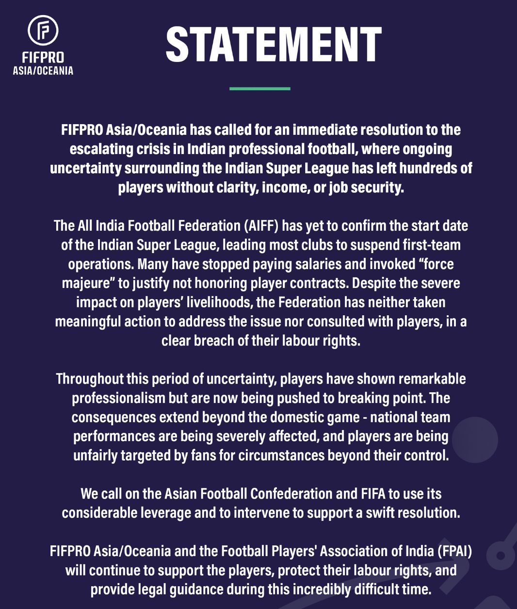"Các hiệp hội FIFPRO Châu Á và Châu Đại Dương kêu gọi một giải pháp tức thời cho cuộc khủng hoảng ngày càng gia tăng trong bóng đá chuyên nghiệp ở Ấn Độ. Sự bất ổn liên tục của Giải Ngoại hạng Ấn Độ đã khiến hàng trăm cầu thủ chuyên nghiệp phải đối mặt với tình thế tiến thoái lưỡng nan về tương lai không chắc chắn, thu nhập giảm mạnh và thiếu an ninh cuộc sống. Liên đoàn bóng đá Ấn Độ (AIFF) vẫn chưa xác định ngày bắt đầu của Giải Ngoại hạng Ấn Độ và hầu hết các câu lạc bộ đã kêu gọi đình chỉ hoạt động của đội một. Nhiều câu lạc bộ đã ngừng trả lương cho cầu thủ và từ chối thực hiện hợp đồng với cầu thủ trên sân về 'bất khả kháng.'"