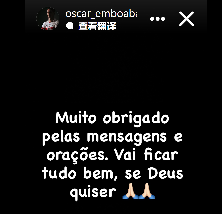 Bây giờ Oscar đã phát hành một bản cập nhật thông qua mạng xã hội: "Cảm ơn rất nhiều vì lời chia buồn và lời cầu nguyện của mọi người. Mọi thứ sẽ ổn. Xin Chúa phù hộ cho bạn."