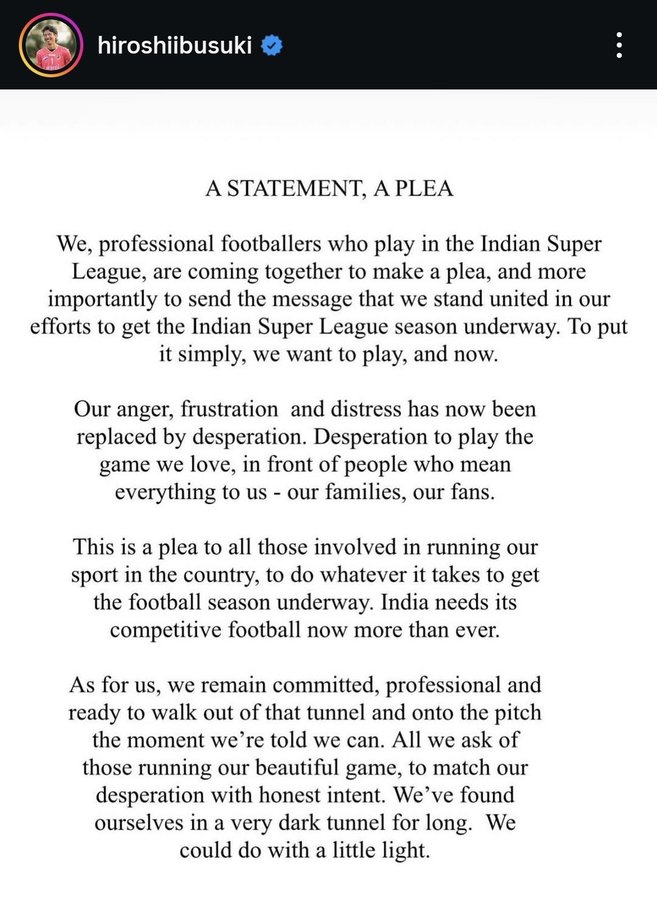 Tiền đạo người Nhật Hiroshi Ibusuki, cựu cầu thủ của Western League và hiện đang chơi cho East Bengal, đã viết một cách giận dữ chống lại giải đấu: "Chúng tôi là một nhóm các cầu thủ bóng đá chuyên nghiệp đang thi đấu ở Indian Super League. Hôm nay, chúng tôi cùng đưa ra tuyên bố này và đưa ra lời kêu gọi: Chúng tôi hy vọng rằng giải đấu sẽ khởi động lại sớm nhất có thể. Nói một cách ngắn gọn - chúng tôi muốn chơi bóng và chúng tôi muốn chơi ngay bây giờ."