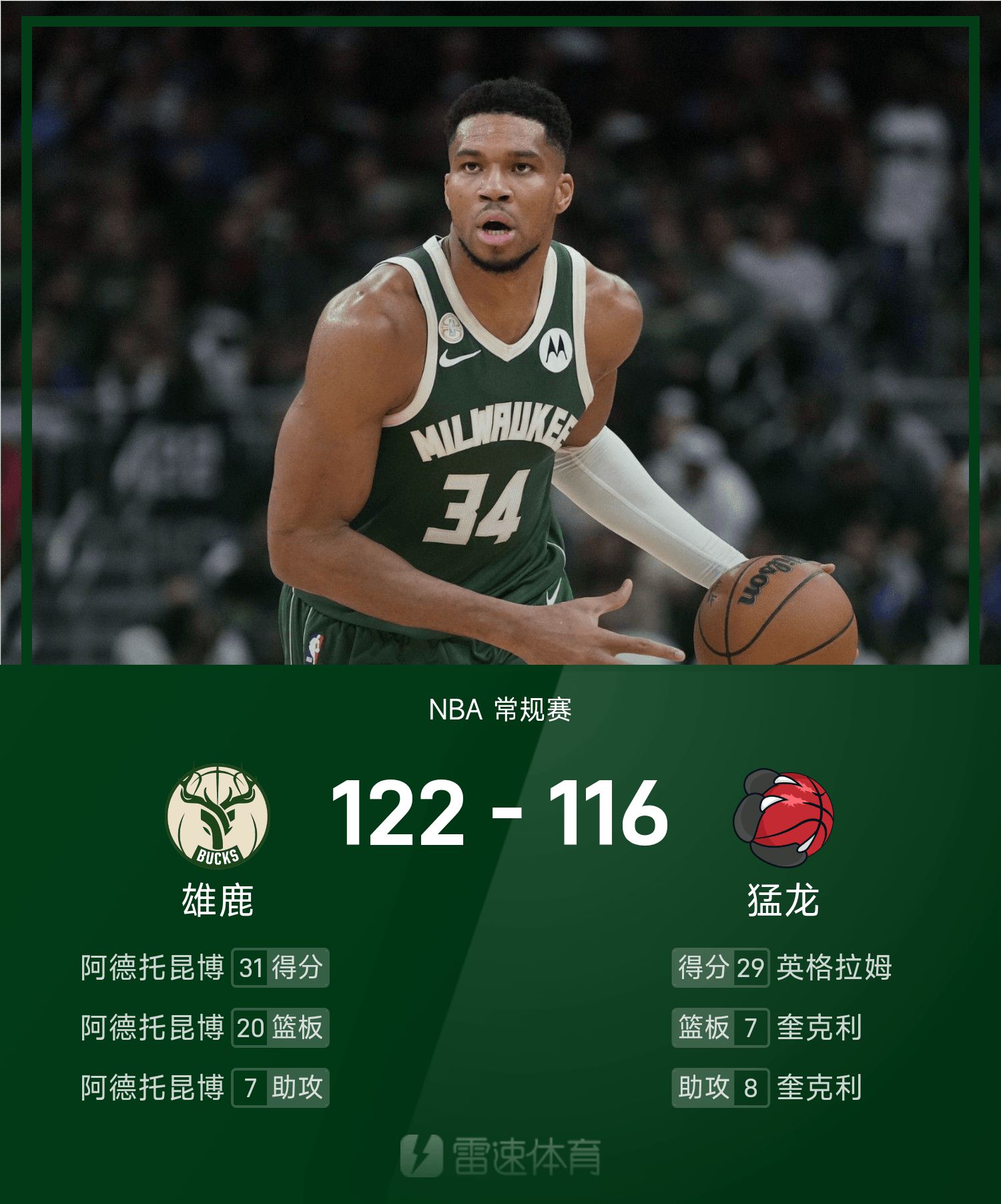 Antetokounmpo thực hiện 11 trong số 14 cú sút và ghi được 31 điểm, 20 rebound và 7 kiến tạo.