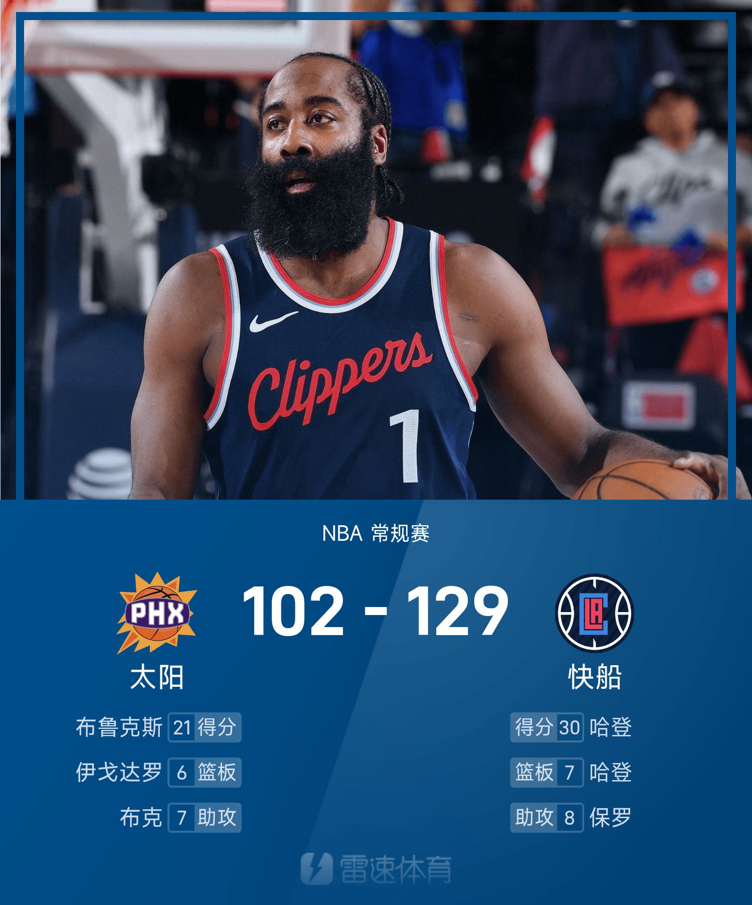 Harden thực hiện 8 trong số 12 cú sút và ghi được 30 điểm, 7 rebound và 7 kiến tạo.