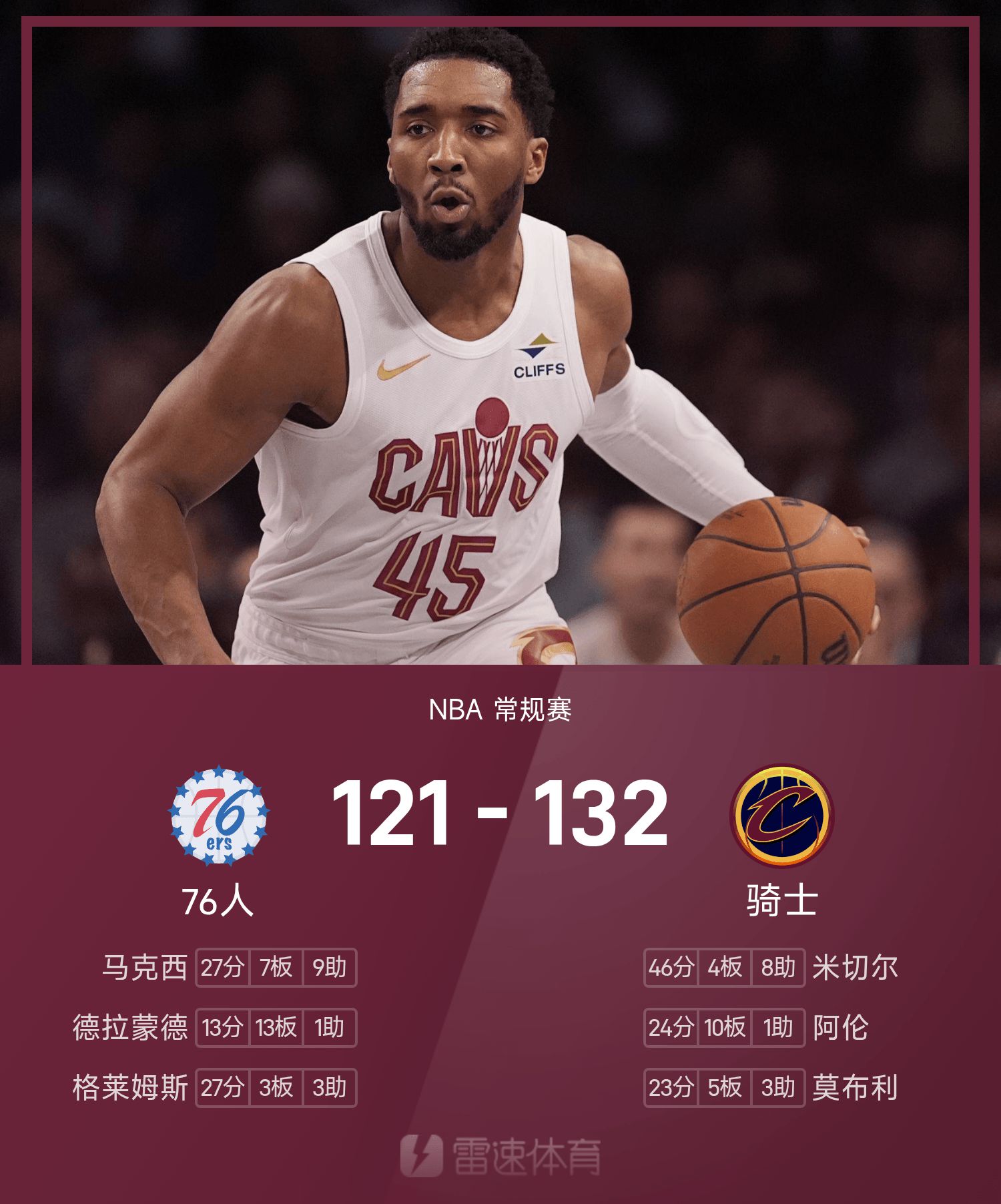 Báo cáo trận đấu NBA: Mitchell 46 điểm và 8 kiến tạo, Cavaliers đánh bại 76ers 132-121