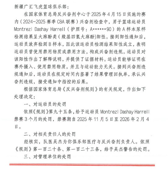 6686 Tin tức thể thao vào ngày 6 tháng 11 Hiệp hội bóng rổ Trung Quốc thông báo rằng mẫu A của cựu viện trợ nước ngoài bóng rổ nam Tân Cương Harrell đã có kết quả xét nghiệm dương tính với cannabidiol và anh ta đã từ bỏ việc kiểm tra mẫu B, đây là một hành vi vi phạm. Cuối cùng, lệnh đình chỉ 3 tháng được ban hành (từ ngày 5 tháng 11 năm 2025 đến ngày 4 tháng 2 năm 2026).