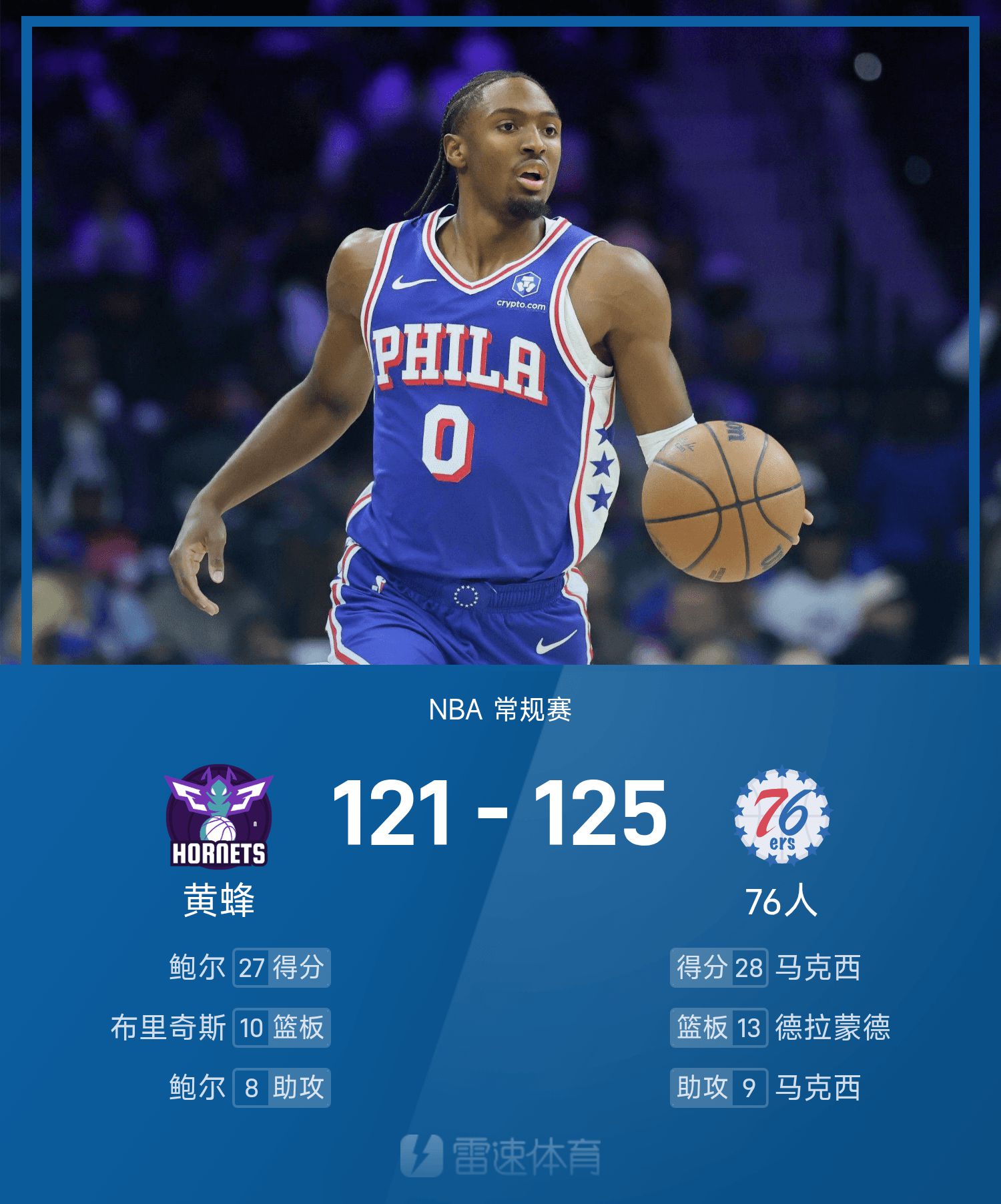 Người bảo vệ 76ers Maxi ghi được 28 điểm, 6 rebound và 9 kiến tạo, số điểm cao nhất trong trò chơi; Cầu thủ dự bị của 76ers, Grimes ghi 24 điểm và tung cú ba điểm quan trọng trong 13 giây cuối cùng để giúp đội đảo ngược tình thế.