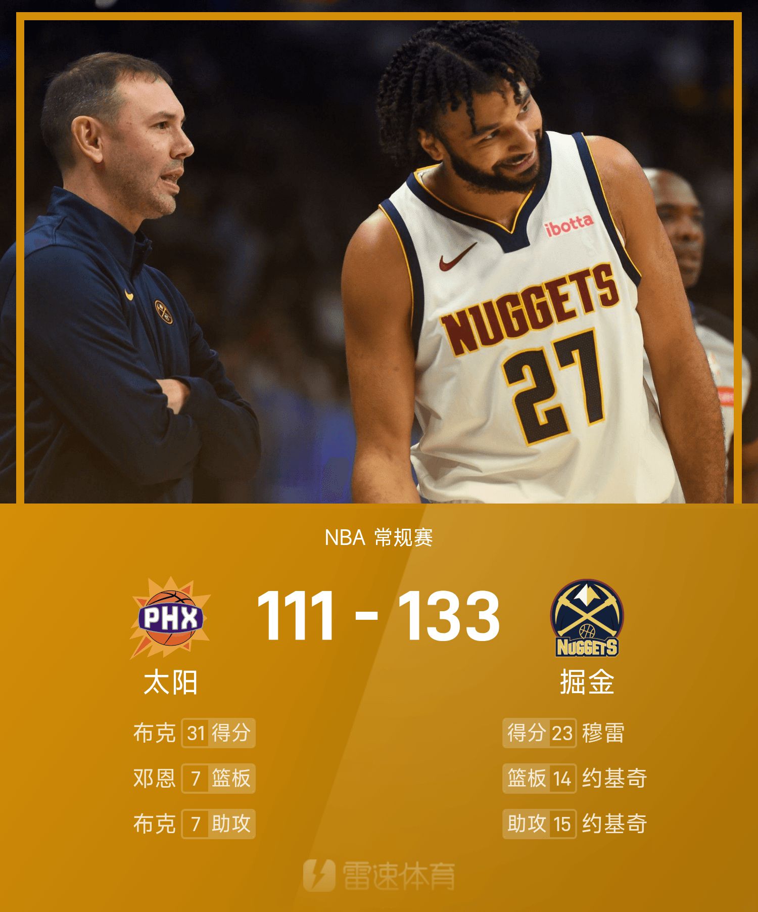 Người bảo vệ Nuggets Murray ghi được 23 điểm, 6 rebound và 5 kiến tạo. Inside core Jokic đã có triple-double trong hiệp thứ ba, ghi 14 điểm, 14 rebound và 15 kiến tạo. Anh ấy đã có cú triple-double trong hai trận liên tiếp.