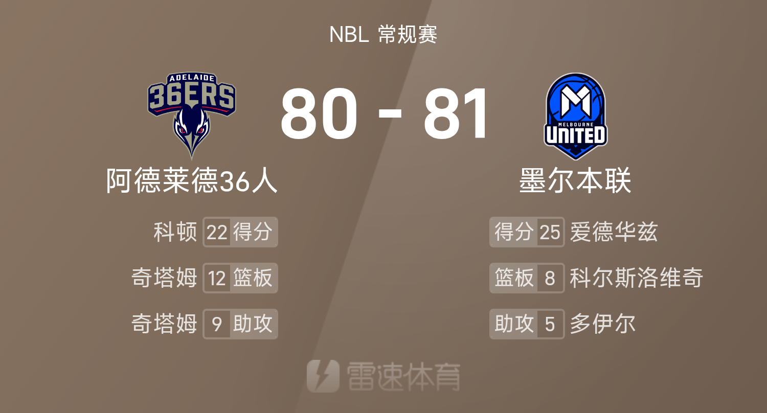 Cuối trận, Melbourne United đã đánh bại Adelaide 36ers với tỷ số 81-80.