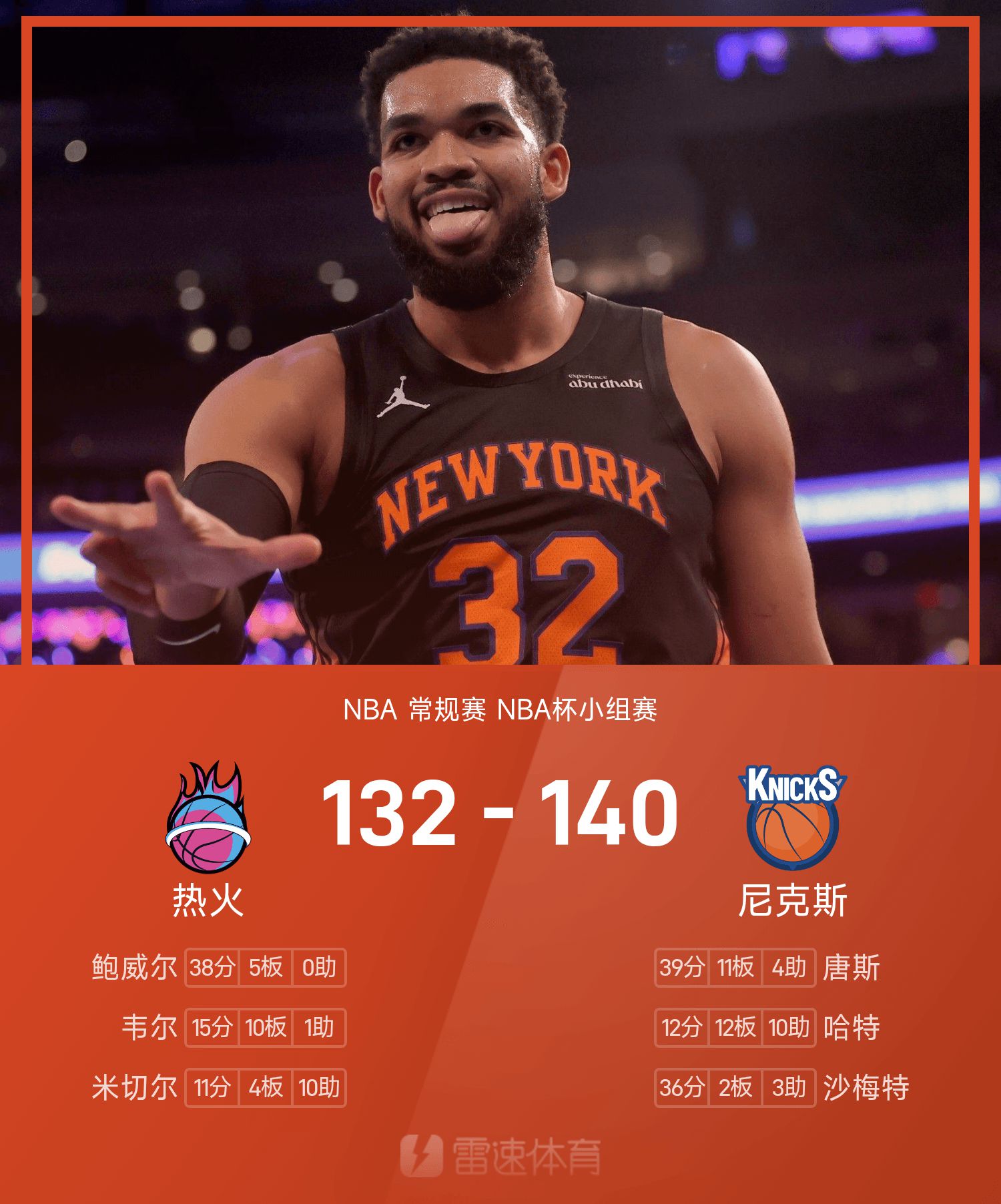 6686 Thể thao Tin tức ngày 15 tháng 11 Trong trận đấu vòng bảng NBA Cup mùa giải thường lệ 25/26, Knicks đối mặt với Heat. Kết thúc trận đấu, Knicks đánh bại Heat với tỷ số 140-132. Towns đã ghi được 39 điểm cao nhất trận đấu, 11 rebound và 4 kiến tạo, đưa Knicks đến chiến thắng.