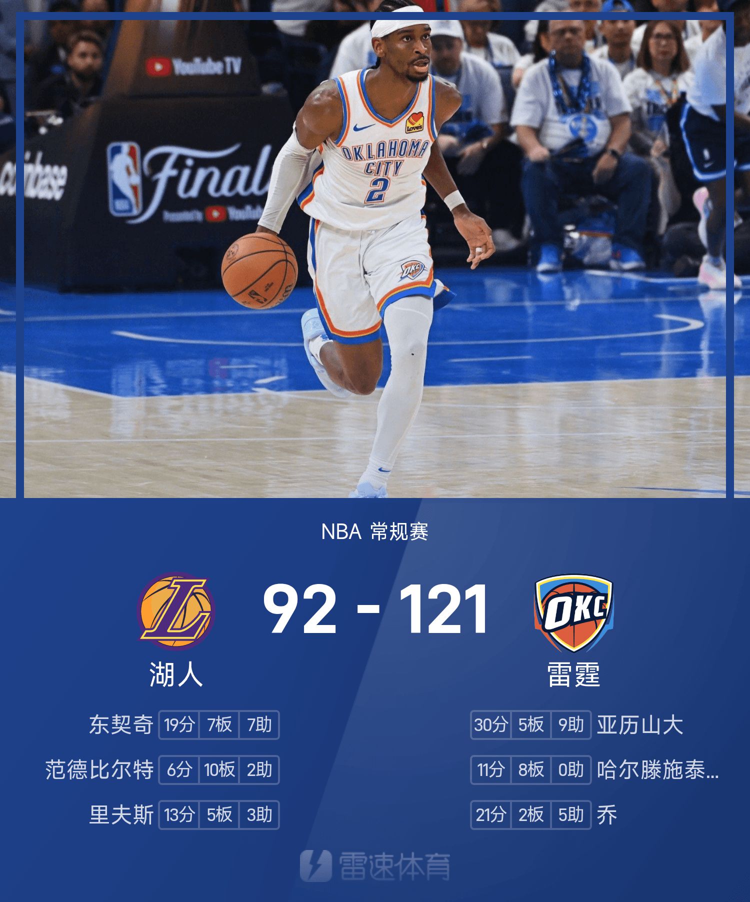 Báo cáo NBA: Alexander có 30 điểm và 9 kiến tạo, Thunder đánh bại Lakers 121-92