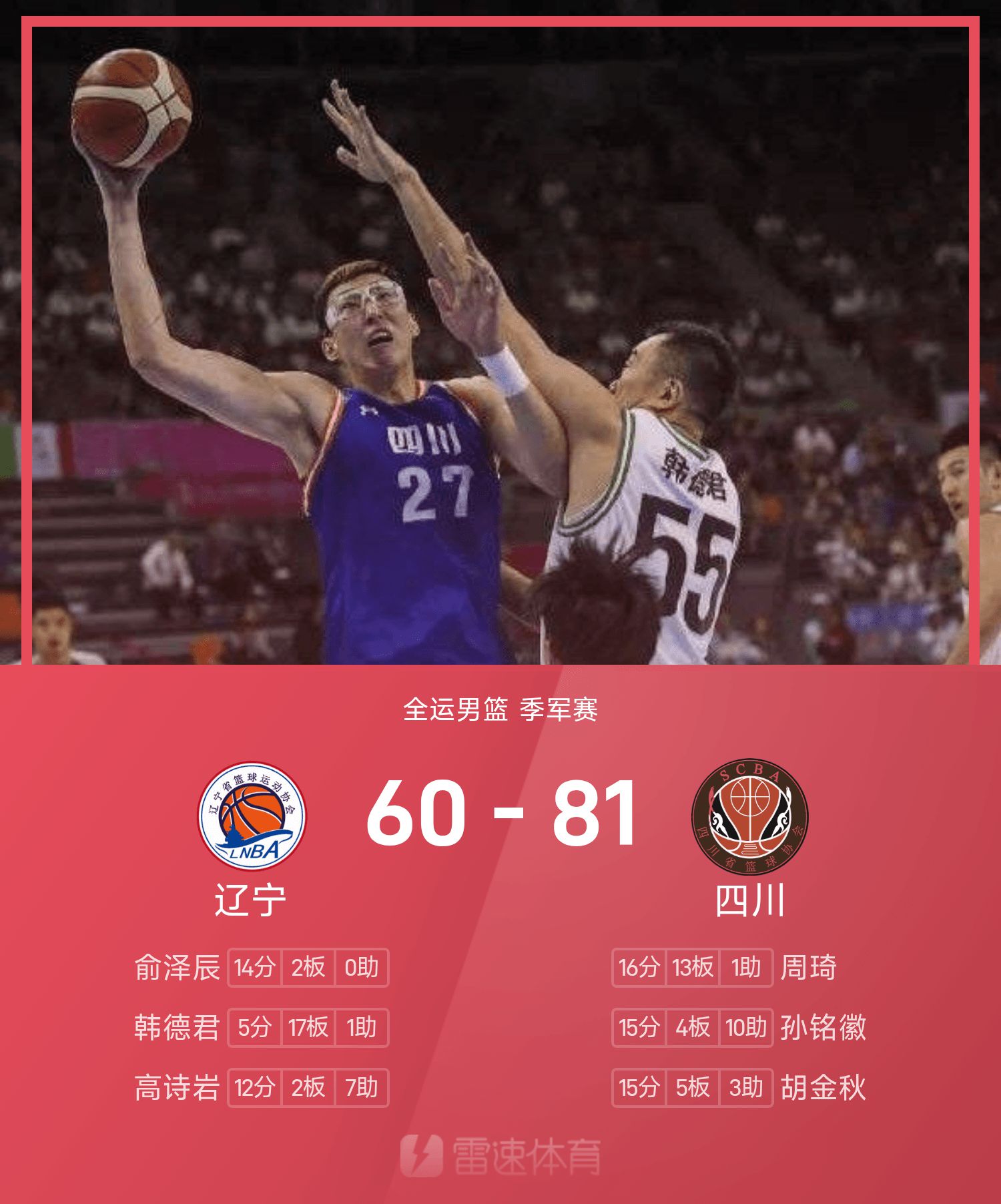 Sau khi hai bên giao chiến, Tứ Xuyên đã đánh bại Liêu Ninh với tỷ số 81-60 và giành huy chương đồng bóng rổ nam Đại hội thể thao toàn quốc.